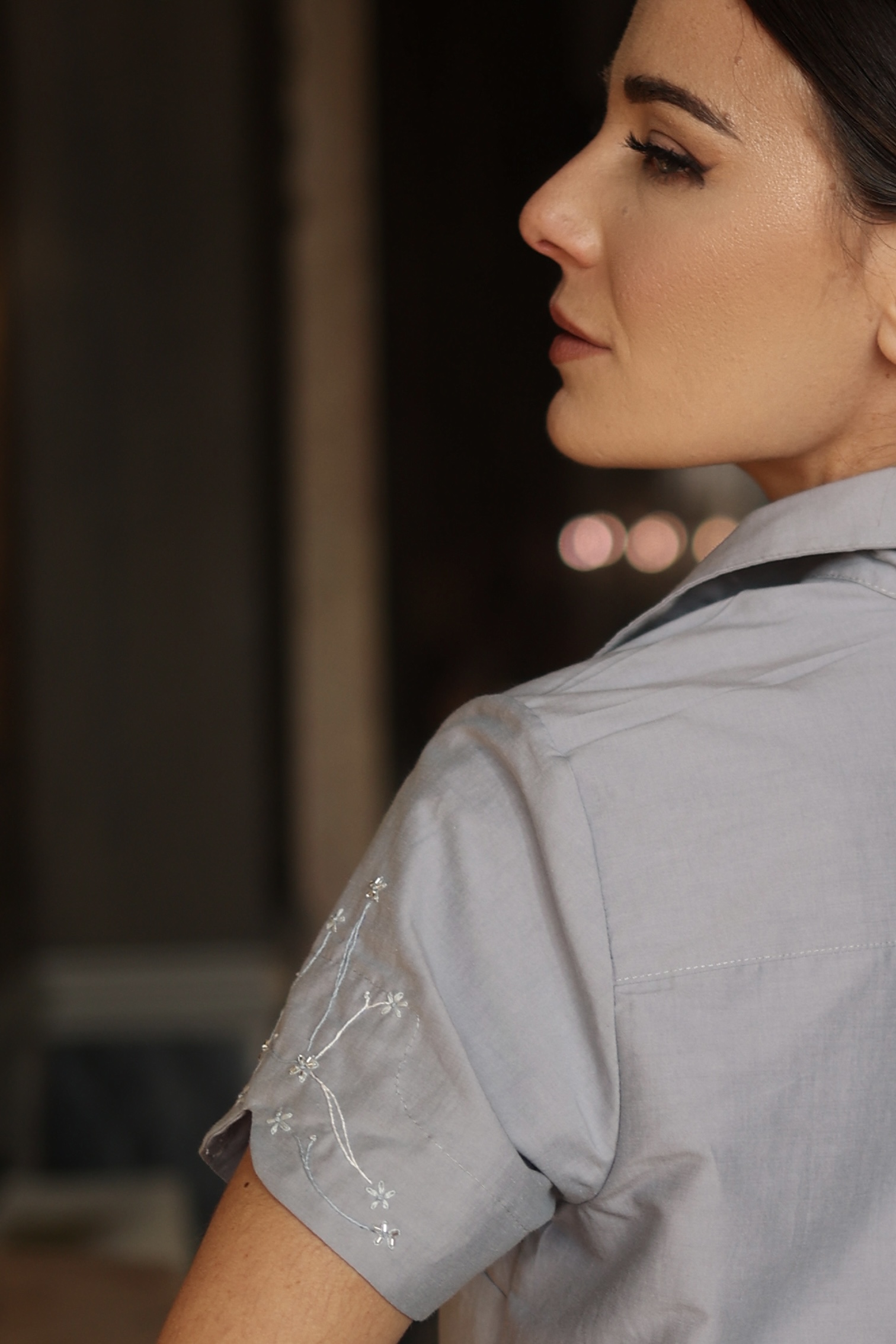Camisa fabricada em tecido de algodão com seda, super confortável e fresca, possui as laterais arredondadas, assim como as mangas que tem ramos que remetem às flores de cerejeira bordados à mão. Seu abotoamento é clássico de roupas tradicionais chinesas, com botões feitos do mesmo tecido da peça. Uma camisa única, que voi elever o seu estilo.
