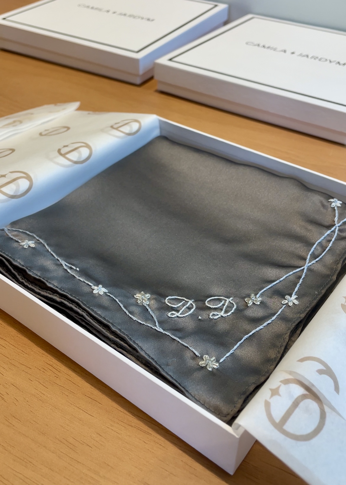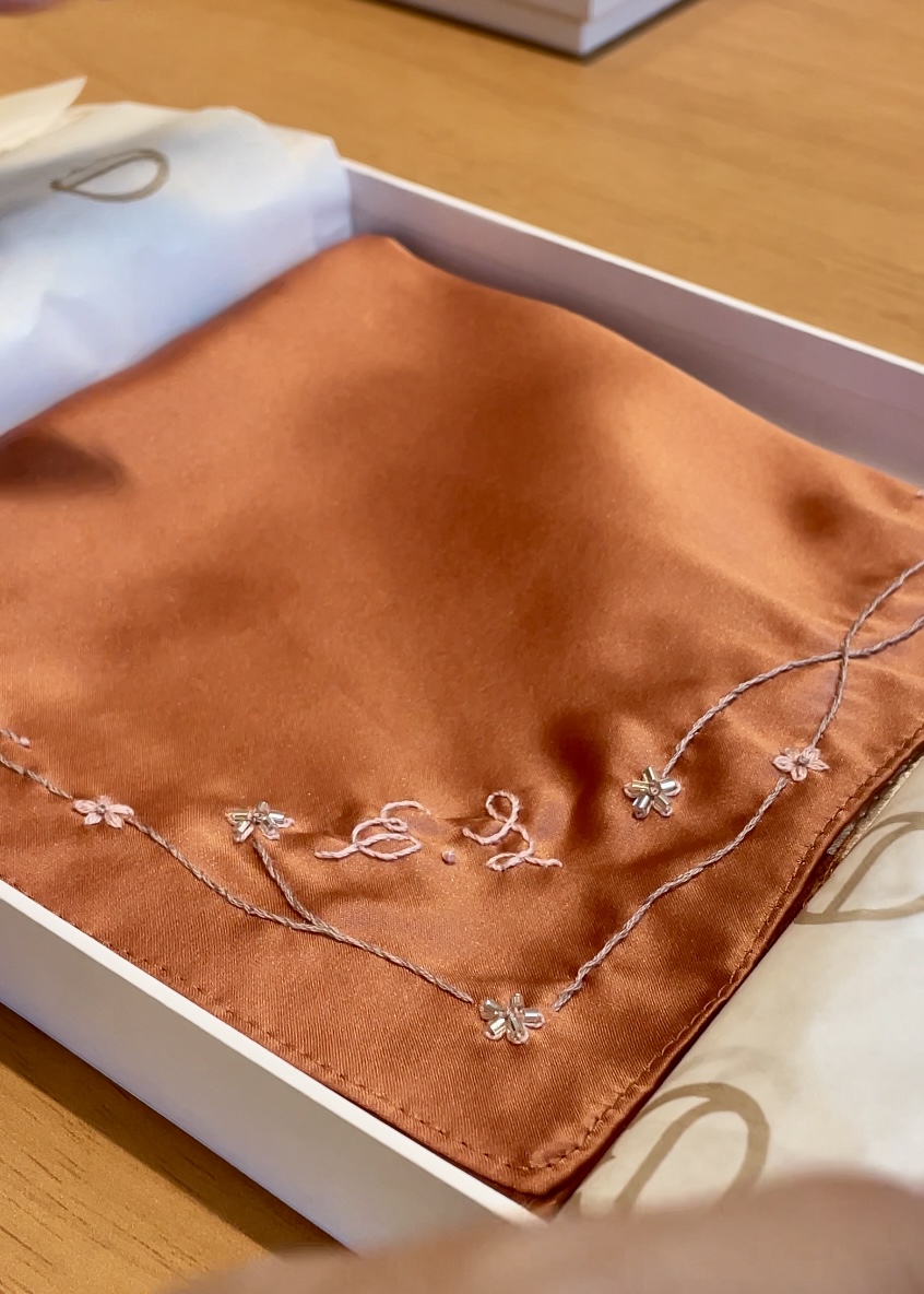 Lenço de seda bordado à mão com ramos que remetem às flores de cerejeira. Pode se personalizado com as iniciais do cliente.