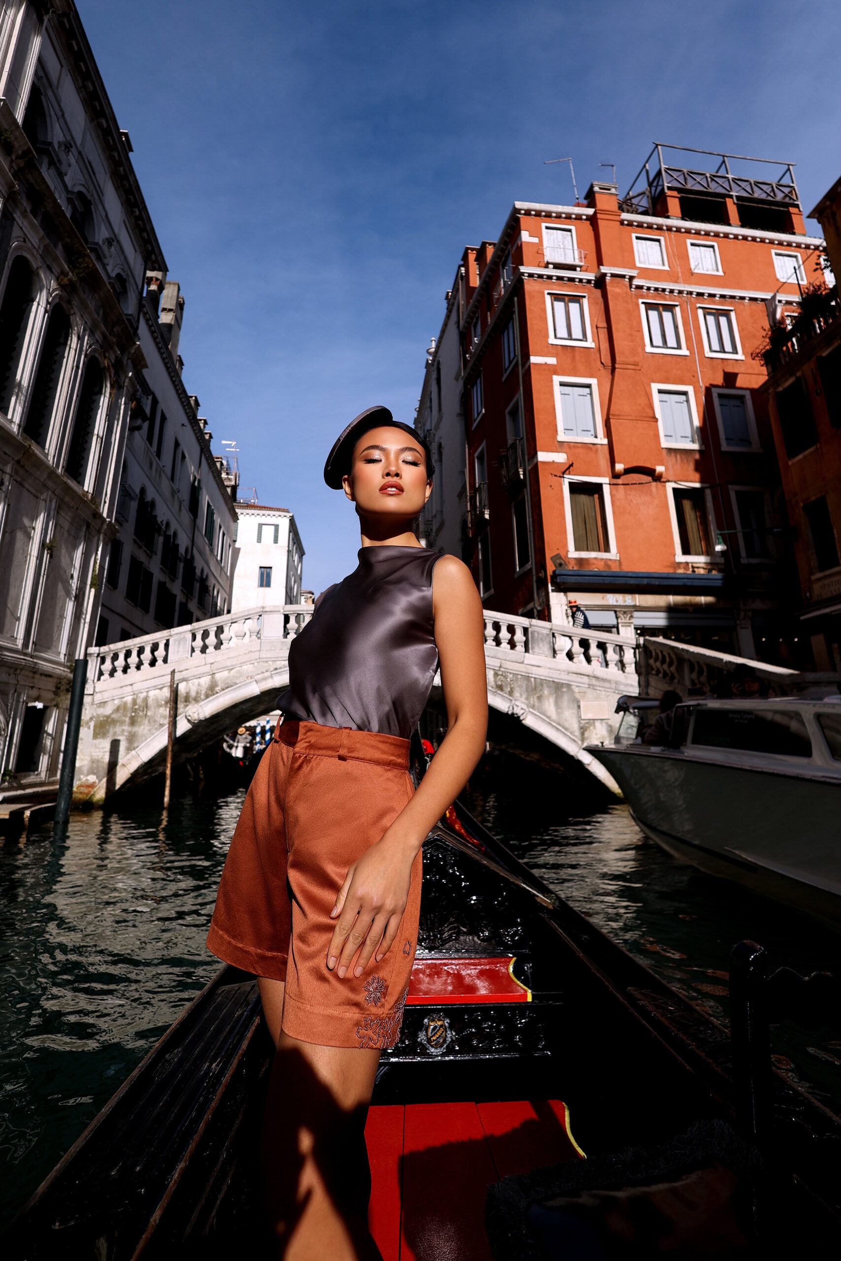 Short de Alfaiataria com as laterais bordadas em pedrarias remetendo às flores de cerejeira do Japão.